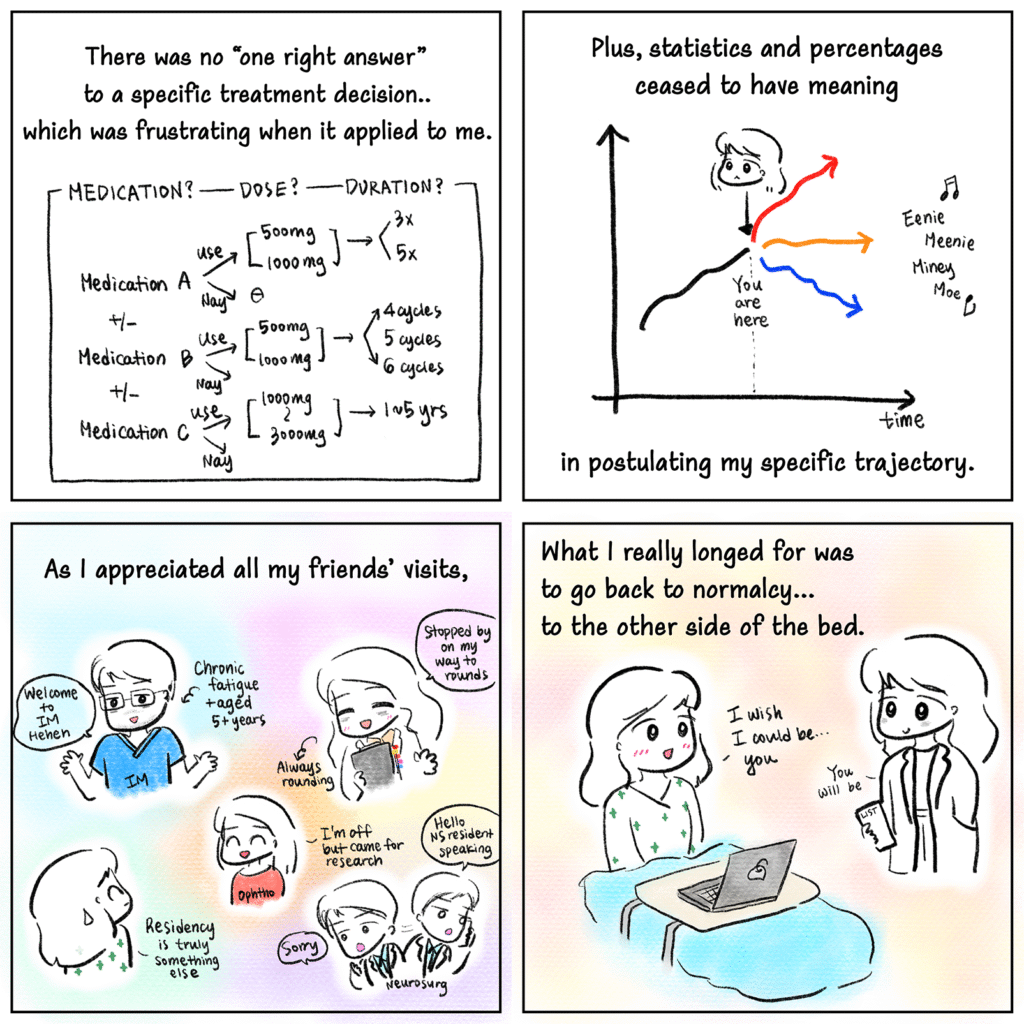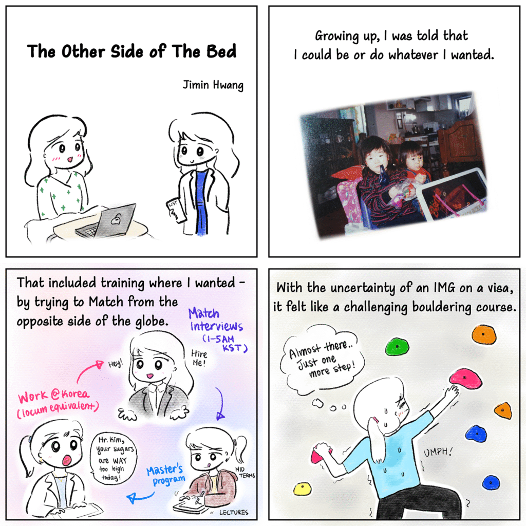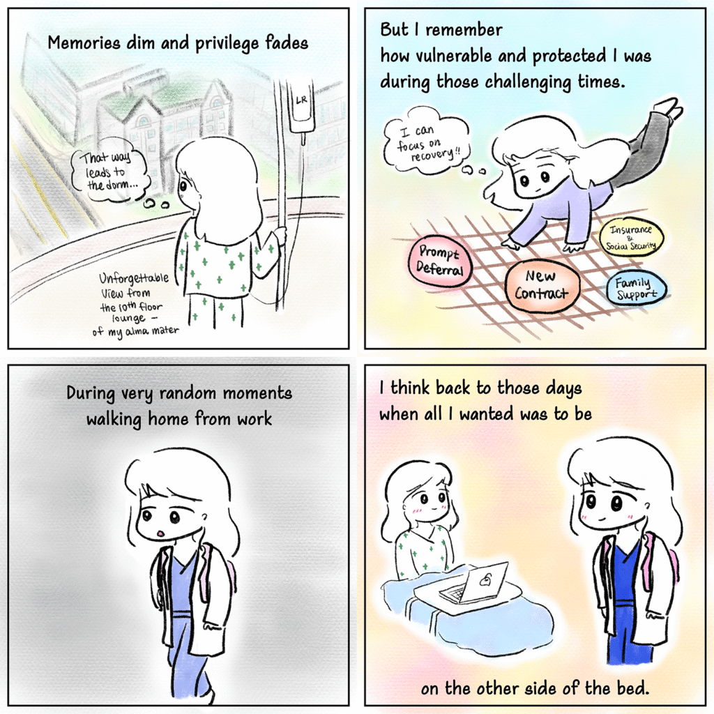 “This short personal cartoon strip depicts when I was hospitalized for three weeks right after The Match. It was a very tumultuous period in my life, resulting in having to delay the start of residency for a year. Due to variable response to treatment, I was unable to predict my trajectory and thus unable to imagine even my close future—the big picture, as we like to say in the hospital. To make matters worse, it was right after The Match; I would see all these people, including my friends already in training, pass by, buzzing with vitality and energy. All I wanted was normalcy and certainty. I desperately wanted to be on the other side of the bed. Three years later, I have grown into a tired resident who jumps and sighs as the pager goes off. This cartoon serves as a small reminder for me about what it was like to be on the other side, what it was like to live in the hospital not as a “resident” but as a patient.”