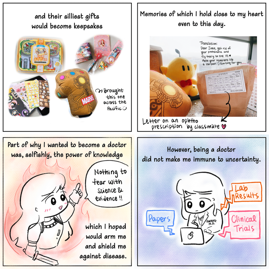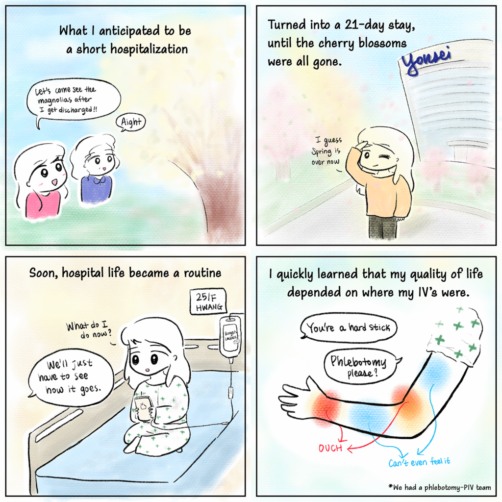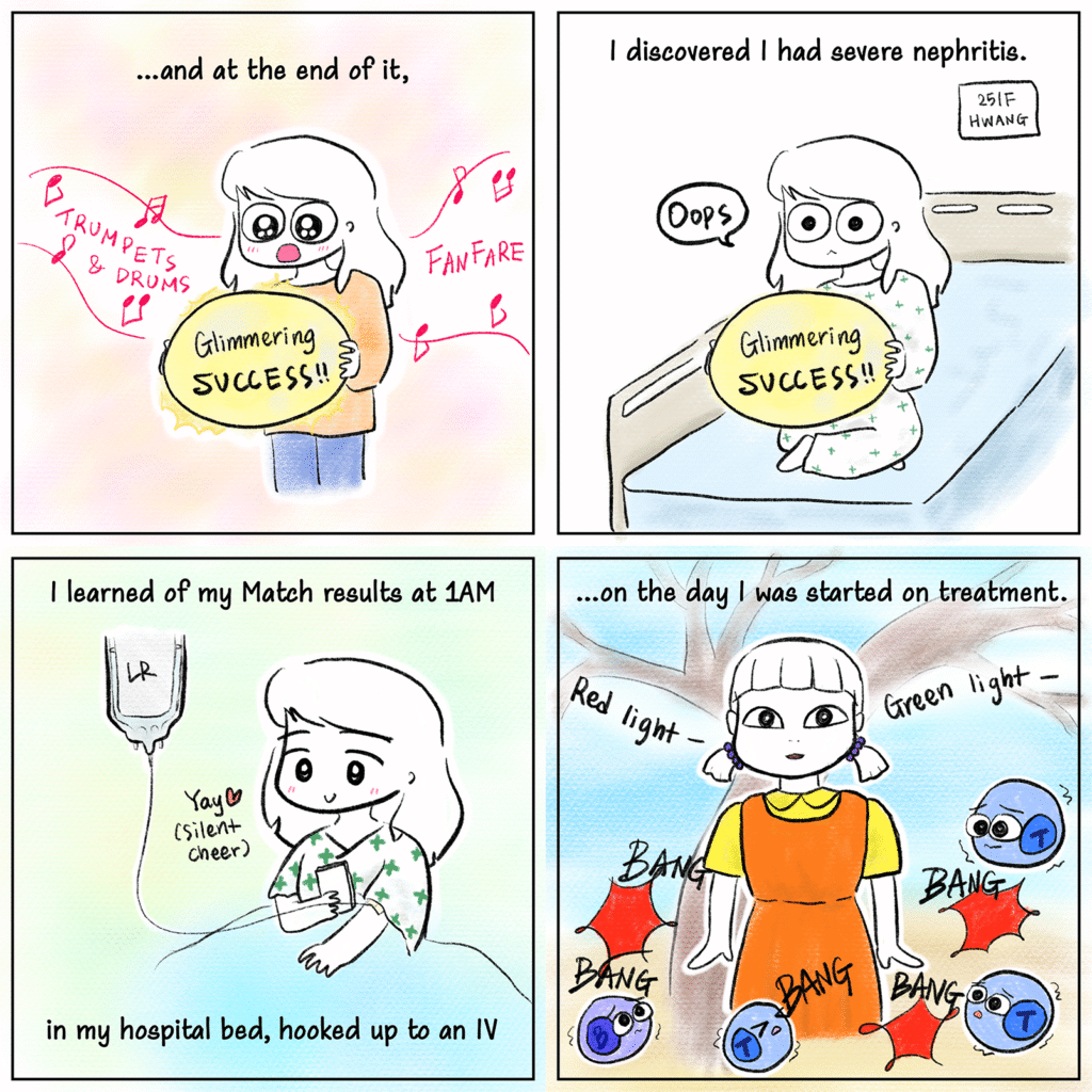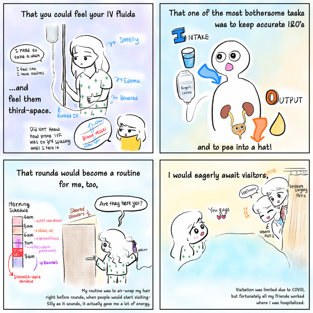 “This short personal cartoon strip depicts when I was hospitalized for three weeks right after The Match. It was a very tumultuous period in my life, resulting in having to delay the start of residency for a year. Due to variable response to treatment, I was unable to predict my trajectory and thus unable to imagine even my close future—the big picture, as we like to say in the hospital. To make matters worse, it was right after The Match; I would see all these people, including my friends already in training, pass by, buzzing with vitality and energy. All I wanted was normalcy and certainty. I desperately wanted to be on the other side of the bed. Three years later, I have grown into a tired resident who jumps and sighs as the pager goes off. This cartoon serves as a small reminder for me about what it was like to be on the other side, what it was like to live in the hospital not as a “resident” but as a patient.”